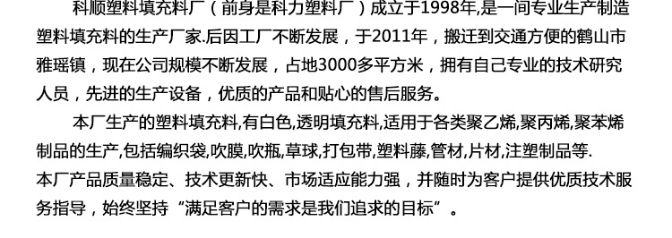 填充料母粒常见的应用领域就是塑料袋的制造,通过规定的加工工艺,填充料母粒可以被加工成轻薄的中空塑料袋,这些袋子具有着很好的耐性和密封特性,是人类社会居民日子以及出产包装不可少的盛装物。 填充料母粒的作用是? 当增加中薄膜中之后,自身产品的透明性不会遭到任何的影响,并且表面光洁度和均衡度较之以往还能增强,增加产品的运用率,相信将来时间中假如大量运用的话,薄膜的运用率也会相应的进步。 填充料